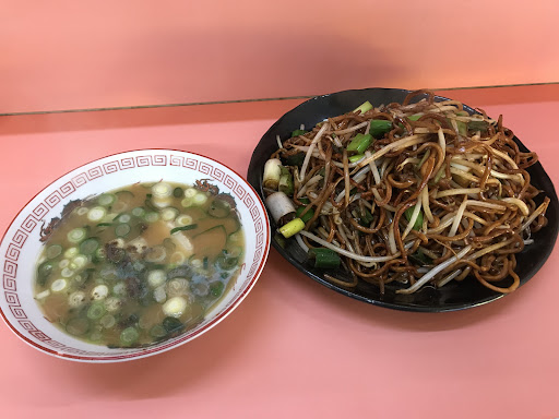 老舗日田焼きそば店がひしめく場所にあります。 駐車場は、路地から店を通り越して、右に曲がった対面の大きな駐車場の一角にあります 日曜日の1時30分訪問しましたが、お客さんもそこそこ入っていました カウンター5席テーブル席4人掛け2席怖がり円卓6人4人掛けのこじんまりした店です 調理人の親父、ホールにはその奥様らしき人がが2人の3人でした(笑) 焼き飯、日田焼きそば、昭和ラーメンをいただきました。