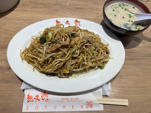 日田市街地から日田インター方面に向かう、国道212号線上り線にあります。花火大会の日に立ち寄りました。店内は満席、花火大会需要でテイクアウトも待ちが出来る中の訪問でした。約30分待ちで席に案内されました。既に閉店45分前でした。まだまだお客さんは捌けない。想夫恋焼きそば大盛り(¥1350-)と中ライス(¥185-)をオーダーしました。約15分で提供されました。10数名分が一気に出来上がり。ホールは2名、調理は1人でした。焼きそばなので多人数分を調理出来る利点を感じました。ソースの量が少し足りなかったのか、薄味の焼きそばになってました...。 このチェーンは味のバラつきが大きいですね。客数が多かったからなのか、常にこうなのかは解りませんが。やはり本店に行くべきなのかも知れません。同行者はパリパリ感が足りないとの感想でした。しかし、焼きそばにこの価格帯はかなり強気です。本店の味ならまぁ、許容範囲なのですが、今日のこの味では評価を下げざるを得ません。客数の多い少ないは私達含む、お客さんには関係の無い話ですから。接客はまぁまぁ及第点。が、早く決めて早く退店して、の焦りと言うか、気持ちが感じられたのは残念です。本店以外でこのチェーンに行く事はもう無いかも。駐車場はかなり狭いです。店の手前に5台程度、同じ敷地にある隣の店舗が廃業しており、その店の駐車場らしき場所に5台程度は停められます。この店舗が満席になる事が有るのか無いのかは定かではありませんが、通常はこれで十分な台数なのかも。焼きそば以外ではラーメンやたこ焼き、餃子、キムチ入り冷麺...