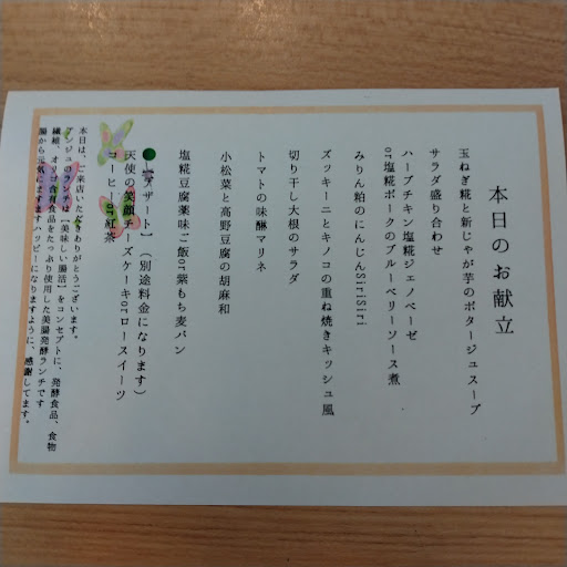 Read more玉ねぎ麹の参鶏湯風スープとデザートセットをオーダー。参鶏湯がぐつぐつと食べ終える最後まで凄く熱くて体が温まりました。ごはんは白米と玄米が選べ玄米をチョイスしました。サラダとキッシュが付いてとても美味しくいただきました。天使の笑顔チーズケーキがとても美味しく病みつきになりそうです。人参ケーキも👍 またお邪魔したいです。 Pay...
