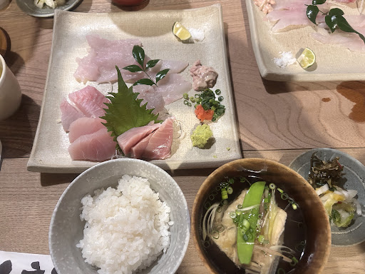 【食事】 お昼にお邪魔しました。基本ランチメニュー(2500円)が数種類あり今回は刺身定食を注文しましま。 まず、煮物とサービスの鯛の煮凝りが出てきました。煮物は野菜が崩れも無くしっかり味が染み込んでいて大変美味しかったです。鯛のあらの煮凝りも綺麗に鱗を処理されていて美味しかったです。一つ一つの仕事が丁寧なのが伝わってきました。 刺身は六種類の刺身が盛り付けられていました。 カボスと塩で楽しむ、カワハギとフグ🐡醤油で楽しむマグロなどなど、カワハギにはしっかりキモがついていて嬉しかったです! お椀には鯛を一度焼いてお吸い物にしてくれてあるので鯛の出汁が香ばしさとあいまってこれまた美味しかったです。 その他一品料理なども注文しましたが、どれも期待以上でした。