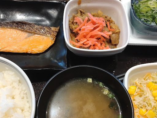 朝6時の朝食として選んだお店。 シャケの入った定食に納豆をプラスして 約@800 大変に満足。 数日前に行った吉野家の味噌汁は糞不味かったがこちらはいたって普通で安心した。 そしてご飯が大変に食べごろになっていて嬉しかった。硬からず柔らかすぎず。朝にピッタリの炊き具合。