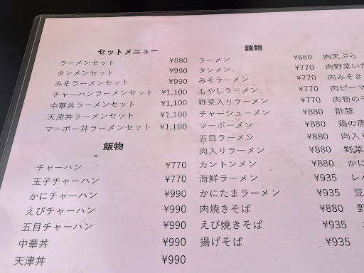 Read more平日の12時に訪問 席は比較的空いています チャーハン・ラーメンセット(ランチ価格¥990)、同行者は五目チャーハン(¥990)をオーダー カッカッカッとチャーハンを作る音が聞こえてきます ラーメンは普通に美味しい正油ラーメン、チャーハンは非常に美味しく感じました 五目チャーハンの具材には、大きなエピ、沢山の銀杏、マッシュルーム、グリーンピース、チャーシューが入っていましたので、五目です 同行者いわく、値段はちょっと高めだけど、丁寧に料理しており、本当に美味しい また連れて来いとのの感想