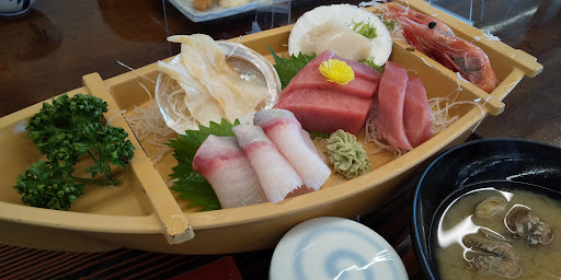 舟盛りは、厚切りマグロ、卵付き甘海老、ホタテ、寒ブリ、貝と大きいアサリのお味噌汁、マグロのしぐれ煮と茶碗蒸しと漬物のセットです。 特に、舟盛りのお刺身とお味噌汁は流石に美味しかったです。お刺身の厚みは、スーパーの刺身の2倍以上あると思います。 知り合いの食べた松定食も、カニのフライがとても美味しかったとの事でした。