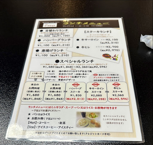 Read more美味しい洋食のランチが食べたくて買い物ついでに遠出してひたちなかまで。 台風で強い雨の日だったにもかかわらず、12時前に到着しましたがほぼ満席。 私は初めてでしたが、一緒に行った家族は何度か来ていて、日替わりランチが値上がりしたのを残念がっていました。 以前は1000円以内で食べることができたようてすね。 この日はスペシャルランチ(¥1680)のお肉とお魚のコースをそれぞれ注文。 前菜はボリューム満点のシーフードサラダ。パスタはトマト味のボンゴレでした。 コースのパスタだとほんの少しかと思いきや、ちゃんと一人前あります。 お味もしっかり美味しかったのですが、アサリの砂がジャリジャリと…。 お肉料理は豚ヒレにチーズとトマトソースがかけてあるものでしたが、お肉も小さく味も普通。熱々ではなくぬるくなっていました。 お客さんが多いから仕方ないのかもしれませんが、ちょっと残念。 お魚は白身のムニエルとしか説明がなかったので、なんのお魚か分かりませんでしたが、鯛ではないように感じました。 メインと一緒にパンかライスが出されますが、こんなにボリュームあるとは知らずにライスを頼んでしまい後悔しました。 最後はデザートの盛り合わせと飲み物が出てきます。 デザートの盛り合わせになぜかただカットしただけのバナナが。 果物なのでデザートにはなるのでしょうが、ちょっと手抜きな感じは否めません。 コスパよくお腹いっぱいになる洋食屋さんなので、人気なのはそのせいかと思われますが、味は普通かな…? お客さんが多くガヤガヤとしているので、お喋りしながらランチを楽しむにはゆっくりで...