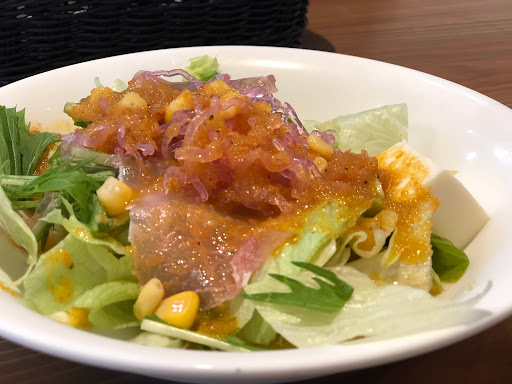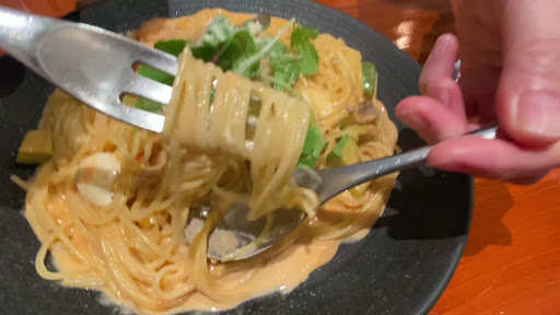 Read more『エビ・アボカド・モッツァレラのトマトクリームパスタ』1,570円大盛り330円増し。(サラダ付き)をいただきました。グルービーといえば名物「海賊スパ」が有名ですが、私はこのパスタがお気に入り。チーズが濃厚なトマトクリームソースに絡み、ぷりぷりのエビが贅沢にゴロゴロと入っていて食感も楽しい一品です。アボカドのクリーミーさとモッツァレラチーズが絶妙に調和し、ひと口ごとに幸せが広がります。ただ、出来立てが熱々すぎて、勢いよく食べるとヤケドしそう(笑) セットのサラダには日替わりドレッシングがかかっており、この日は酸味が効いたニンジンドレッシングでした。シャキシャキのレタスをメインに、生ハムとチーズ豆腐がトッピングされ、さっぱりとしつつも満足感のある一皿でした。