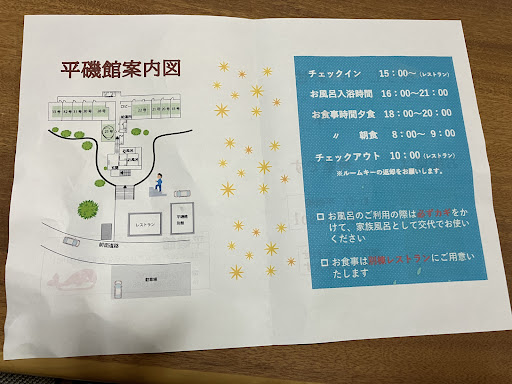 Read moreゴールデンウイークに家族で一泊しました。客室棟は階段が多く、かなり年季が感じられます。共用スペースなんか床がふかふかして抜けるんじゃないかと不安になるくらいでした。お部屋は6畳の部屋が2つつながった形で、広々と使えました。お布団は自分で敷きます。トイレ、風呂、洗面は共用です。お風呂は家族風呂が2つあり、予約制ではなく、空いていれば使えます。ベビーバスや子ども向けの椅子があり、無添加系のシャンプー、コンディショナー、ボディソープが備え付けです。湯船のお湯がアツアツでした。 共用スペースにはポット、コップ、各種ティーバッグ、おやつがありご自由にどうぞ、となってました。冷凍冷蔵庫も自己責任で使えます。 お料理は別棟のご飯屋さんで食べます。子どもにも年齢に応じたメニューを用意してくださり、小さい子がいるからか小上がりの座敷席にしてくださって嬉しかったです。ごはんも美味しかった。 駐車場は道路向かいにあります。 高級感を求める方には向きませんが、近くのアクティビティの拠点にするに...