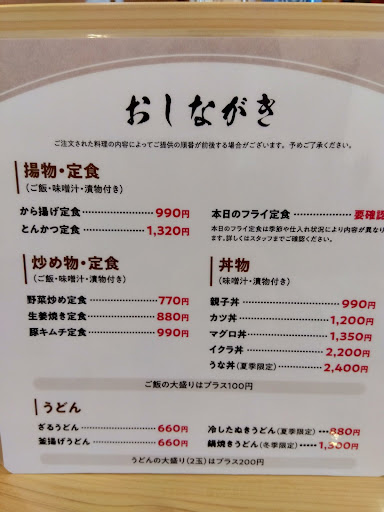 昼の営業時、ただでさえバタついているのにいろいろ尋ねるのも悪いなと遠慮して何も聞かずに会計を済ませて出ました。 料理に関して。星ひとつマイナスの3つ。 調理人も慣れていないのでしょう。 暫くしたら再評価したいと思います。 夜7時頃、お店の前を通ると営業していました。 どうやらお酒のとおつまみの提供をしているようです。 昼は定食、夜はお酒飲食の二毛作店になった様子。 ざるうどんは讃岐うどんです。讃岐「風」うどんではないですよ。 提供されたとき、もうちょい量があればなーと思いましたがコシがあるので噛みしめることになります、その結果満足できましたw