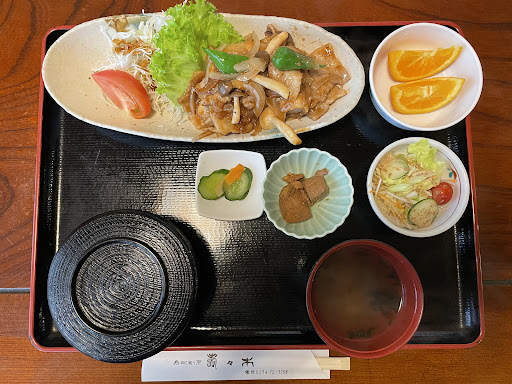私たちはミックスフライ定食と生姜焼き定食を頼みました。驚くほどのボリューム。そしてさらに茶碗蒸しが後からくるというではありませんか。 フライは5種類ほど、生姜焼きは盛り盛りの豚肉以外にぶなしめじ、ピーマン、玉ねぎも入っていて野菜もたっぷり。早い時間の夕ご飯としてお腹いっぱいいただきました。今どきありがたいご飯もとても美味しかったです。