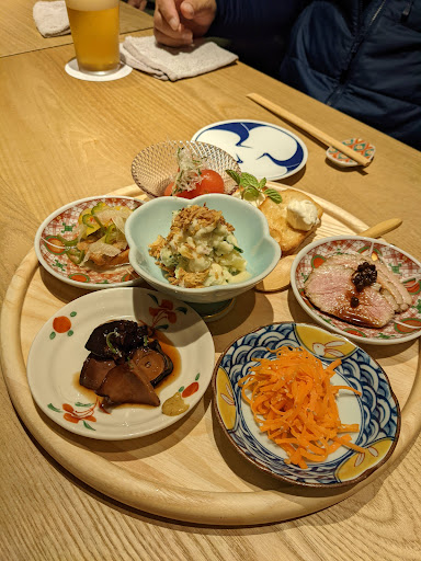 令和3年11月下旬にオープンしたお 店。和加栄さんが久遠食堂さんに変わりました。12月11日に8人でお邪魔。お店の改装で、お洒落な空間に変わっています。二酸化炭素濃度計もレジ横にあり、ウイルス対策も抜かりありません。刺身などの魚だけでなく、若者向けの肉系・揚物系のメニューが充実し、また一品毎のポーションが大きくて、お腹も大満足です。コピー用紙を束ねた手書きのメニューが嬉しい。お酒もサワー、焼酎、日本酒、ワインと充実。ワインは山梨と群馬と国産ボトルのラインナップ。一本3千円から4千円くらいとまずまずのお値段。おつまみ三種盛りと刺身盛りは包丁上手で大満足。赤なまこ酢も美味しい。個人的にはアジフライ。これはプロの商品でした。絶品。思い出すとヨダレが出てきます(失礼!) コスパも良く素敵なお店なので、小人数でも団体でも、ヘビーローテーで使っていきたい気持ちです。ご馳走さまでした。お店の方も若くて明るくて素敵でした...