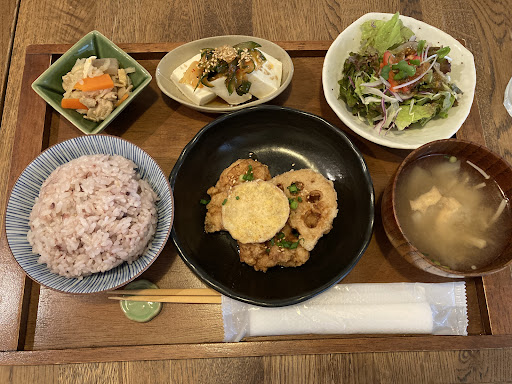 日替わりランチを頼みました。野菜中心の小鉢が3種と 雑穀米のご飯と味噌汁に、メインの甘辛たれの唐揚げ💗 どれも美味しくて とても満足しました。ランチに付いているデザートのシフォンケーキとミルクプリンも 優しいけどしっかりした味で美味しかった💗 200円で付けられるドリンクのコーヒーも デザートと合っていて、ぜんぶに満足の行くランチでした😋💕