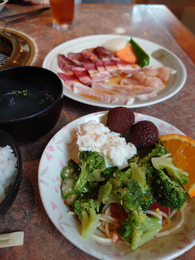 Read more全てに置いて不味い店 ランチで来店。バラエティとカルビを注文。 バラエティの肉は脂身ばかりのものが出てきた。カルビのほうも硬く、旨味感じなかった。しかも3人での利用でトングは1つのみ。相手に気を回しながらトングを使うはめに。 ライスは表面がねちょねちょしていてとても焼肉に合うものではなかった。米質が悪いのか、炊き方が悪いのか、その両方か、、 吸物の容器の外側下部にはネギが4,5切れついていた。 ランチにはサラダバーがセットになっていた。サラダ自体の質は気にならなかったが、サラダバー設置場所が喫煙席側のスペース!仕切りもないし、被喫煙者にとってはタバコ臭く感じた。サラダを取りに行くと強制受動喫煙させられるシステム、これはマズくないですかね。今や分煙意識が高くなってるのに誰も疑問を上げる者はいなかったのか?子ども連れやタバコ嫌いは要注意。サラダは無くなっても追加されなかった。早い者勝ちサラダバー。 あとレジに来たおばさん店員は背中ボリボリ掻きながら面倒くさそうにノロノロ歩きだった。 当方味覚は並レベルと思っている、それでもここのは不味いと感じるものだった。(他2人も不味いリピ無しと話していた。) 食事時〜会計まで不快な時間だった。