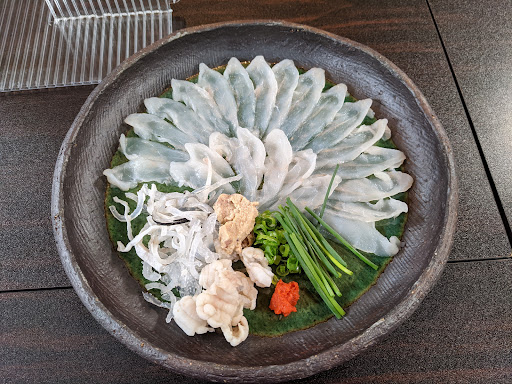 毎年の河豚シーズンにここでコースを頂きます。個人的には防府市で河豚を味合うなら、ここが一番と思っています。十人以上が楽に入れる座敷も複数あり使いやすいです。もちろんカウンターでのお一人様もOK。市内のふぐ料理は、美味しさの競争が激しいので、相当なレベルです。 少し厚めに切った刺し身からは、河豚の旨味がじわっと出て参ります。ぬる燗で旨さが倍化。大将の福田さんは包丁上手。道具のお手入れも良くて、全然金気はありません。白子の焼きも絶妙。また茶碗蒸しにも白子。どちらもふわふわアツアツで、悶絶級の旨さです。魚の旨味を堪能した頃合に河豚の唐揚げが供されます。衣のサクサク感と、まるで高級な鶏肉のような滋味旨味。口中が一遍に切り替わります。そして、再度河豚の王道に向かい合う鍋の登場です。地元の特産品の春菊や椎茸、白菜が脇を固め、美味しいスープを河豚と作ります。シメのおじやはこれまた絶品。思い出すと涎が出て来ます。旨い以外の言葉が思い付きません。シーズン中に何回か通いたい店。 あっ、ここはノドグロの煮付けやアワビの肝焼きも超絶な...