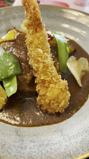 今回は海老フライカレーをごはん大盛りで注文しました♪ カレーはルーは濃厚で食べた時はそれほど辛みを感じなかったけどあとからくるスパイスカレー♬ 海老フライや茄子やオクラ、おそらく手作りのポテチなど色とりどりです! 味もとてもおいしかったぁ!