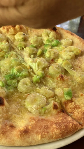 ピザ生地が独特で、もちもち生地。 チーズも独特の使い方をされてて、粉状のチーズを全体にかけてから焼かれており、香ばしい香りがします。 クラッシックなマルゲリータとは違いますね。 エビとアボカドピザはトマトソースではなく、チーズソース?でしょうか? 上からふりかけてるチーズがソースのようでしょうか?オリジナルなピザで、美味しく頂きました。