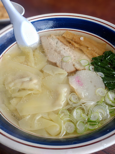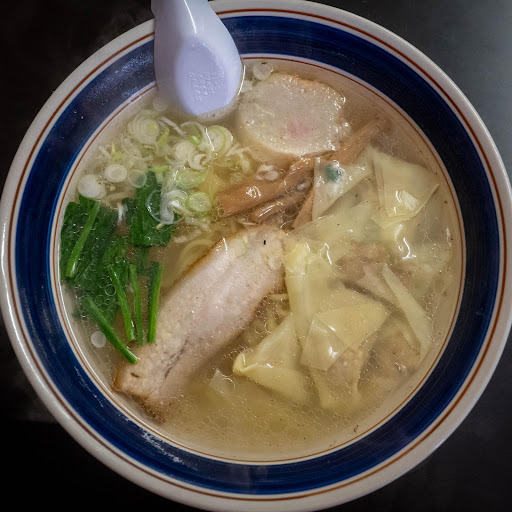 塩ワンタンメン750円税込をいただきました。 息の長いお店です。一本奥の路地に店舗があった頃以来なので、四半世紀ぶりかも知れません。 正油ラーメンが美味しかったという印象がうっすら残っていますが、今回は塩ラーメン+評判良さげなワンタンをチョイスしました。 黄金色の透き通ったスープは、比較的最近の、昭和というより平成の函館を代表する塩ラーメンといった感じです。滋養軒もそうですが、無事之名馬的なお店に共通した味というのでしょうか。突き抜けて美味しいわけではないけど、だからこそ食べ飽きないシンプルな味わいです。 ラーメンと言えば塩味しかなかった時代の、例えば末広町の鳳来軒や、棒ニの向かいにあった国鉄購買部の食堂、そしてそれを受け継ぐ──麺の柔らかさまで受け継いでしまった(笑)鳳蘭の味に比べると、ややシャープさに欠けるような気もしますが、充分に函館を感じさせてくれるトラディショナルなスープです。 麺は令和にアップデートしていました。やや太めでコシの強い現代的な麺といった感じです。さっさと食べないとボヨーンと伸びてしまった昔麺とはエライ違いです。 チャーシューは肉肉しさと噛み応え重視タイプ。トロトロやホロホロの対極にありますが、肉食ってる感があって良いと思います。 ワンタンは…美味しい思うのですが、よく分かりませんでした。ワンタンと言えばマルちゃんの激めんワンタンメンぐらいしか食べたことがないものですから…すみません。 自分的にはやや塩加減が強めだったため、スープを飲み干すことはできませんでしたが、量もほどよく、総じて美味しくいただくことができました。 ちょっと残念だったのはお値段。事前に入手した情報が古かったのか、予想より50円高くなっていました。現在、塩ラーメン・正油ラーメン 700円となっていますが…ちょっとお高いかな? できれば前の値段に戻していただきたいなーと思いました。 あと、トイレが秘密の場所になっていて、求める者しか救われない状態な理由が謎で、ちょっと不親切かなーと思っていたのですが、もしかすると、トイレだけを借りる方々が多くて商売になんねーや!という事情があったのかもしれません。なんせこちらのお店、あろうことかバス亭の真ん前徒歩1秒という立地ですから。まあ、想像ですが。 なんにせよ、店主であろう男性とホールの女性の対応も丁寧で、やはり無事之名馬な、常連客に愛されるお店なんだなーと思います。 今回は塩ラーメン+ワンタンでしたが、元々はこちらの正油ラーメンが好きだったのでした。なので、次回は久々にぜ...