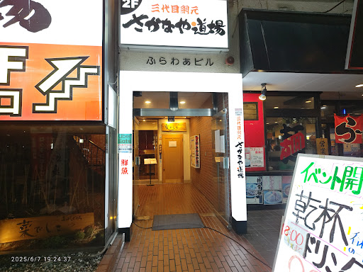 場所は南口出て左側の「ふらわあビル」とか言う昔からある雑居ビルの1階。 入口に白色に輝く「さか◯や道場」の門構えがあり、 こちらのチェーン店の入口と間違えそうが、 お店はこの門構えを潜った奥の1階にひっそりとある。