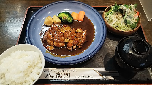 ハンバーグは程よく粗めの具材がこんがり程よく焼けてて、上に大根おろしと青じそのトッピング。肉の旨味に満たされます。 付け合わせのサラダもボリュームがあり、 セットのミニ蕎麦(うどんか蕎麦がえらべました)も美味しかった。