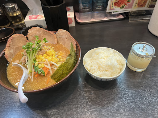 Read more初めて伺いました。 駅前ですので駐車場がないのでは思い寄りましたが、なんとありました! メニュー見ますとラーメンの種類が多く迷いました。 チャーシュー味噌で半ライスを付けることにしました。 提供は早めです。 ニンニクと漬け物も一緒に持ってきていただけました。 麺は硬めであまり煮えていない様。量も少なく150グラムあるかないかです。 ただ、チャーシューは大きく、3枚はいってます。海苔もついているのでご飯に巻いて食べるのにちょうどよかったです。 コーンも結構ありました。底に沈むので、汁まで完食です。味は良かったです。