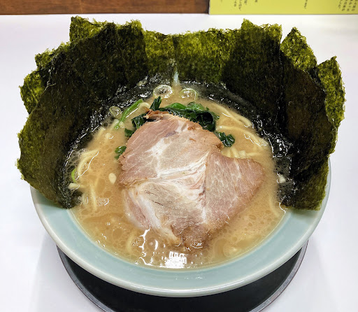 待っている間に店内に貼ってあった家系ラーメンの定義を確認していた。 豚骨醤油ベースの中太ストレート麺で、表面に鶏油が浮かび、大判海苔、ほうれん草、刻みネギ、チャーシューが乗っているのが定番だそうだ。