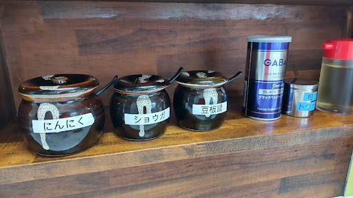 トッピングにしょうが、にんにく、その他に豆板醤、酢、コショウが置いてある。
