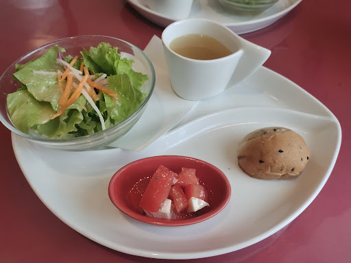 控えめな サラダ/スープ/パンから提供。 酸味のあるドレッシングのかかったレタス、トマト&チーズのマリネ(カプレーゼ?)、黒ゴマのセサミパン/コンソメスープ。 サラダに具材がなく、トマトのマリネ入れちゃいましたが、パンと合わせて食べたほうがベストな感じでした。スープは、ドレッシングを入れるような容器に入っていて少し抵抗ありましたが、旨味あり美味しく頂きました。