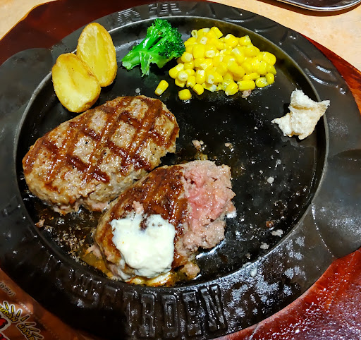 Read more会社の人から美味しいと聞き今日初めて来店しました 夕食時直前だからか満席程ではなくすぐに座れました とりあえず看板商品である爆弾ハンバーグキングサイズのにんにくソースと爆弾セット(ライスかパン+ドリンクバー)を頼み置かれた水を一飲みしたあとドリンクバーへ ドリンクバーにはジュース類、ホットドリンク、お茶のサーバーがあり全年齢が普通に利用できる品揃えになっている 適当なドリンクを取り席について暫し 店員がナイフとフォーク、1枚の紙を持ってきて 商品提供時にソースが跳ねるので紙で塞いでくださいとのこと 商品が提供され紙で壁を作り店員が鉄板に載ったハンバーグ1個を半分に、なるほど、メニューの2つ表示は半分に切った後なのと理解 その後ソースをかけて跳ねが収まってからお召し上がりくださいとのこと 跳ねがある程度収まったのでナイフで切り分けると中は多少赤いが別に気にならないのでそのまま一口 うん、普通のハンバーグ ただソースの味はかなり好みで美味しく感じた 付け合せは厚切りポテト、ブロッコリーのボイル、コーンソテー ソースに絡ませるとなかなかの美味しさ ライスは基本小盛りでお替りは何度もできるがハンバーグはあまり大きくなく塩などの調味料もないのでお替りは1回のみでした