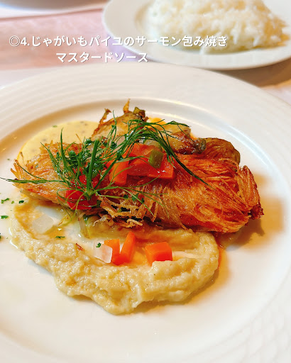 選んだもの 1.若鶏モモ肉のマリネサラダ 2.赤魚のポワレ バルサミコ酢風味 4.じゃがいもパイユのサーモン包み焼きマスタードソース 5.キノコとタラコのスパゲティー