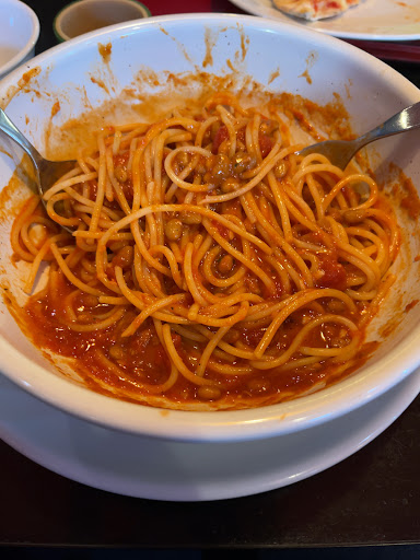 問題は席に着いた後。 スープを飲むなどして待っていた所、店員さん「すみません、ボロネーゼ系が今切らしておりまして…」(頼んだのは納豆ボロネーゼ)とのことなのでとりあえずメニュー見てもっかい同値段帯で決めますねーとにこやかにお話する。 その後た3分くらい決めかねていたら、店員さん「すみません…やっぱりお作りできます」疑問には思ったけど喜んで承諾したら出てきたものは殆ど挽肉のない納豆トマトパスタ………正直ショック……写真は食べかけでゴメンやけど、この店ではコレを納豆ボロネーゼというらしいです🙃