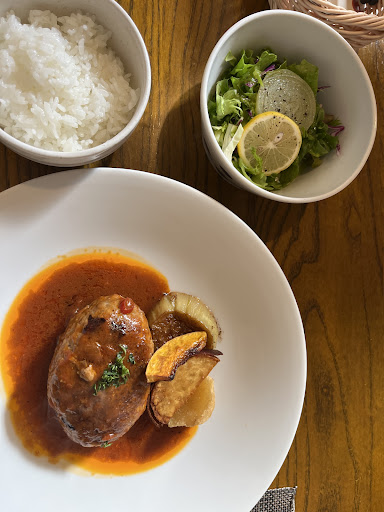 食堂だと思って入ったらオシャレなカフェでした。 ハンバーグランチ(ハーフサイズ)を頂きました。 まずサラダ ソースはペッパーとオリーブオイルとアボカドのようなソースでしたがアボカドかも分かりませんでした。 次に冷たいスーブ 何のスープか忘れましたが美味しく頂きました。 その後ハンバーグとご飯。 ソースは優しいお味で ハンバーグも柔らかく 添えてある輪切りのゴーヤはとても苦くごぼうも素材の味がそのままです。 あと1つ付け合せは何か忘れましたが美味しかったです。 器もとても可愛いです。 ただご飯が熱いので 茶碗を持つ手は熱いです。 コーヒーカップもおしゃれな形で可愛かったのですが...