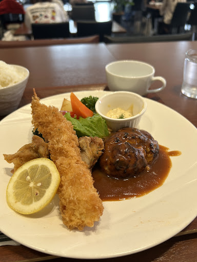 お得な日替わりランチは売切れていたので、ポークジンジャーBセット950円にしました。 病院隣接ということで健康を意識しているのか、私が選んだものは味付けが控えめでした。素揚げされていたナスや根菜類など野菜が多めでした。豚肉は厚切りで、思っていたより量がありました。豚肉には玉ねぎすりおろしがかかってヘルシーでした。 サラダはオリーブ油&塩のシンプルな味付けでした。料理を受け取りに行ったとき「サラダにチーズをかけますか?」とスタッフさんに聞かれ、削ってかけてもらいました。 コーヒーは薄かったです。