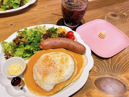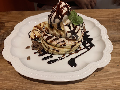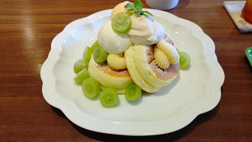 This is the cutest little pancake cafe I’ve ever been to. When you walk in you’re greeted by the soft sound of Ghibli music and led into a room decorated with homely furniture. I got the limited edition muscat soufflé pancakes, and my uncle who came with me got their choco banana pancakes. Both were very delicious. The pancakes themselves were not overly sweet, so they paired well with the cream and ice cream they were served with. The dishes were super beautifully presented. The drinks were pretty average but were served in trays with cute jars of milk/sugar. This place is kind of out of the way, but definitely worth the find....