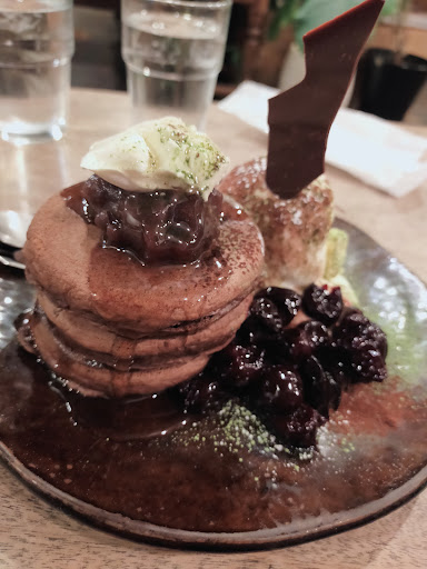 ココアパンケーキを頼んだら 初めて食べる組み合わせで 上に餡子とクリームチーズがのっていて 隣にバニラアイスとヨーグルトがかけてあって チョコレートがささってて プルーン?みたいな味の小さなベリー系の実がたくさん添えられてて