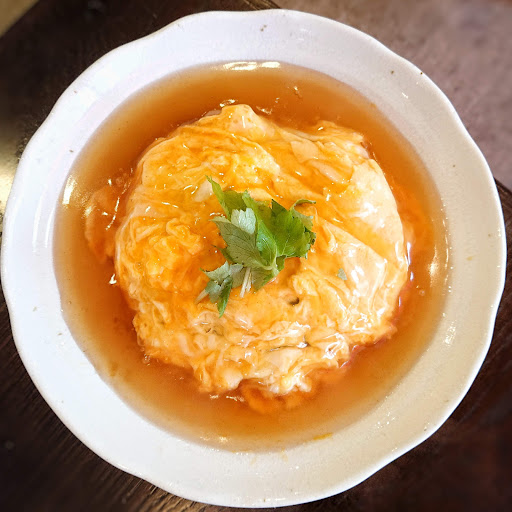 オムライスの見た目は天津飯みたいで、和風お出汁の餡がかかっていました。 中にはシラスと大葉・海苔がたっぷり。上にはミツバまで載っていて、お出汁の旨味がシッカリとしながらもサッパリと頂けました。
