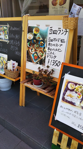 店名mameri通り、たくさんの豆皿料理がちょこちょこと味わえ女性に嬉しい。 豆皿ランチは、日替わりメインとスープを選べて、+豆皿9品、五穀米、デザートとドリンク付きで1,400円。 デザートとドリンク無しだと-150円です。