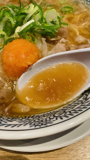 【スープ】 背脂が浮いた熱々醤油スープ 豚肉と背脂の甘みが旨し