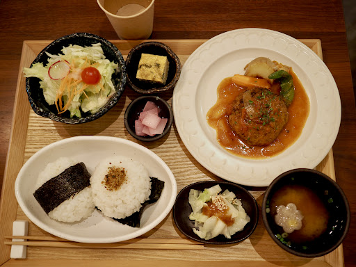 ◆satonoごはん 税込 1,320円 メインのハンバーグの他にはオカラ入り卵焼き、玉葱のマリネ、温キャベツの味噌ソース、味噌汁、 サラダ、おにぎり2個。 どの料理も味は優しめで女性向きに感じます。 濃いめの味が好きな私にはちょっと物足りなかったけど、身体には良さそうだ。 おにぎりは多分塩は振ってない?と思う。 ご飯に海苔を巻いたのと、敷いてある海苔に裸のおにぎりを乗せて振りかけをかけたものです。 塩の味が無かったので、ご飯感覚で箸でつつきました。 量的には腹7分目くらいかな。