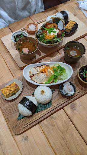 野菜が色々、嬉しい 薄味だけどいい。 ハンバーグ、とても小さい 唐揚げは大きかったです。 だけど、大きいからか粉っぽくて揚げきれてなかった。 揚げてるのではなくノンフライではよくあることなのでそうなのか? だけど家ではよくても店でメインがこれでは致命的なのでは? おにぎりも具がなく海苔も噛み切りにくくなんだかなぁ 見栄えはいいけどこれならお茶碗にご飯のほうがいい