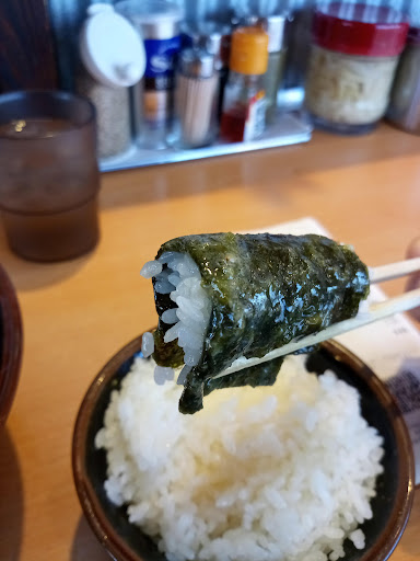 大きめだけど緑色がかって目が粗い海苔は スープに長く浸すとアウト。口に入れると溶けます。 磯の香りが強いタイプで、風味はまあまあって感じでした。
