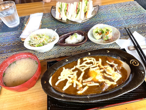 遅めの昼食として、焼きカレーとミックスサンドをいただきました。 焼きカレーは、たまたま同席した地元のお客様もオススメだったようで、「ここの焼きカレーは間違いないよ〜♪」と教えていただきました。焼きたての焼きカレーは、チーズが上に乗っており、卵の黄身も入っていて辛すぎず、優しい味に感じました。また、味噌汁・生春巻き・カブの漬物・野菜サラダもついており、とても満足でした♪ ミックスサンドは、パンがふわふわしっとりで、それだけでビックリしました。サンドしてある具材も新鮮なトマト・キュウリ・たまご・ハムのみで、味付けのマスタードソースと絡まって、シンプルながらも感動するほど美味しかったです‼︎