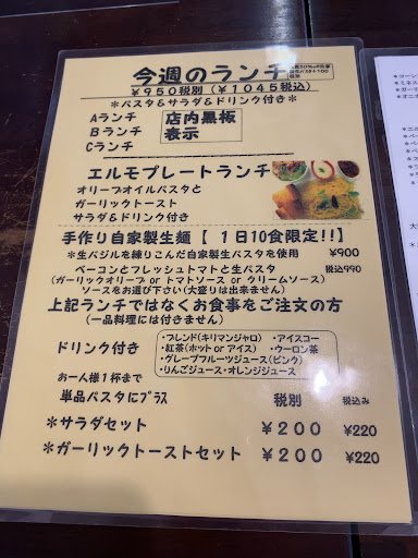 Read more平日のランチで職場の昼友ちゃんと利用しました。 駐車場に車が1台止まっていただけなので空いてるかな? と思い入店するとほぼ満席状態でした。 たまたま1席空いていて直ぐに座れて良かったです! ランチメニューの ABCからパスタを選びサラダ、飲み物付きを注文しました。 エビとズッキーニのモッツァレラチーズのトマトソースパスタ、アイスティをチョイス。 追加でガーリックトースト(200円) アイスティは茶漉し付きで自らグラスに注ぐスタイルでちょっと楽しかったです。 サラダもドレッシングが美味しかった。 ガーリックトーストは厚めの食パン4切もあり、2切ずつシェアしました。 パンの食感がふわふわサクサクで最高に美味しいガーリックトーストでした! パスタもボリュームたっぷりで味もこれまた最高に美味しかったです! ランチ以外にもパスタや他のメニューの種類が豊富で気になるのが沢山ありました。 お値段もリーズナブルなので他のメニューも...