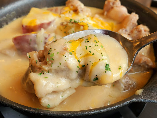 Read more松屋さんの噂を聞いて、食べに来ました!なんと、シュクメルリ!ジョージア料理!牛丼屋さんで、なんとなく期待はしていませんでした。松屋さんにも今まで行ったこともありせんでした。食券を買って席に座り、お冷もセルフで取りにいきます。食券を買った時点でオーダーが通っていて、出来上がったら食券の番号が店のパネルに表示されて取りに行きます。さあ、出来上がった!五徳の上に鉄鍋があり、そこに待望のシュクメルリ、鶏もも肉とサツマイモのクリームシチュー、その上にとろけるチーズ、一口食べたら、なんとすごいニンニクの風味、クリームにニンニク、意外なくみあわせ、不思議な味、なんとご飯に合うんです!サラダを付けた方が、いいと思います。途中で、口の中をリセットして、また、いただく、ご飯大盛り、ペロリ食べました。割と鶏肉が、沢山入ってて、サツマイモの甘みが、にんにくを引き立てて、美味い!また、松屋さん...