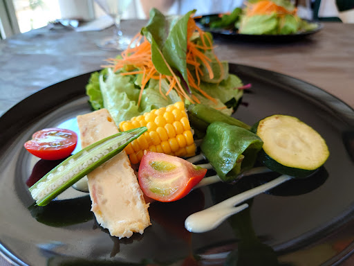 さてさて、料理は「季節野菜のサラダ」からスタート。見た目にも華やかで良いですね!夏野菜の活力がモリモリです。ドレッシングも野菜とマッチしていました。