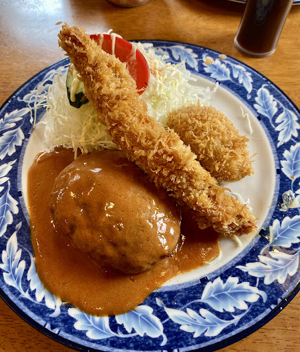 ハンバーグはふっくらジューシー。 透明な肉汁がじゅわっと溢れるのは素晴らしいですね。 エビフライもサクサク。 がっしりした海老なので食べごたえはあります。 個人的な好みで言えば、もう少し柔らかめのほうが好きですが。 コロッケはさすが手作り。 じゃがいもがとろっとろで、最高です。 欲を言えばもう少しミンチが入ってると嬉しいですね。