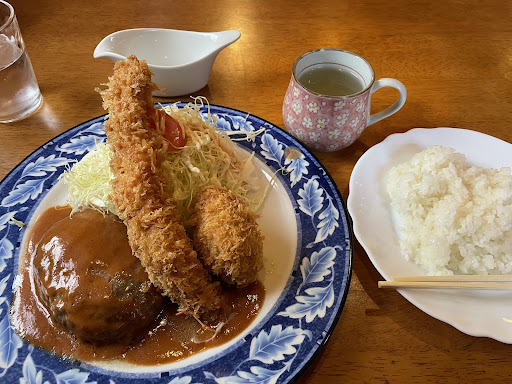 Read more小さな可愛い喫茶店。 会社の人とランチで行きました。 「わらくスペシャル」を注文。 ハンバーグ、エビフライ、コロッケ 優しい味のちょっぴり甘めのデミグラスソースのハンバーグは肉汁多めで美味しい! コロッケも人参など野菜が入って凄く美味しかったです。 最後にちょこっとデザートが出てきてお口直しに丁度良かったです。 生姜焼きも気になるメニューでした。