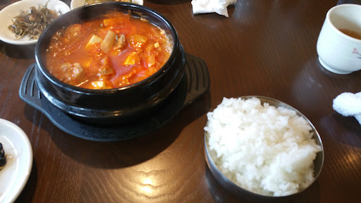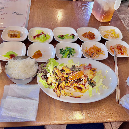 キムチチゲは鉄鍋に入っていて熱々、ちょうどいい辛さで美味しかったです。 小鉢はキムチなど日頃馴染みのあるものから韓国のローカルっぽいものなど様々。 ご飯はおかわり無料なので、半分もらってお腹いっぱいで完食。 この内容なら1100円でも...