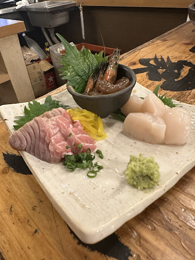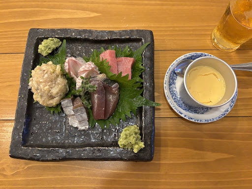 ツマミと言っても刺し盛り1000円としめ鯖500円しか無いので2品とも注文で終わってしまった。 刺身は3種でマグロ、はまち?、茹でタコ。 マグロもはまちも脂のりすぎてて苦手なやつで気持ち悪くなる。タコは味が無く硬いだけ。 しめ鯖は〆過ぎで真っ白。 呑めず、喰えずで楽しく無く1時半には退店。 期待した自分の情け無さにガッカリした。