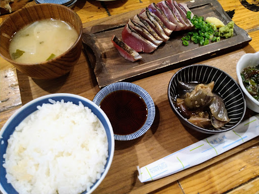 かつおのタタキは1/4身くらい分が薄めに10切れほど。皮目だけ炙ってあり、小葱の小口切りと生姜とわさびが添えてあり、まあまあ美味しいです。 お椀はあら汁にダイコンとタマネギとワカメ。白味噌でちょっと甘口。 ご飯は、、、茶碗ちっちゃ!...