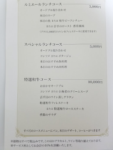 Read more息子の小学校時代のママ友たちとの久しぶりの再会で、学校からも近いこのお店を選びました。いつも1階のヤマザキパンで買い物したあと、2階のお手洗いによったときに、横を通るとヤマザキには似合わない(失礼)重厚感ある店構えで気になっていました。 中に入るとやはりゴージャスなつくり。席もゆったりしています。ランチは3,150円~で、前菜、パン、メイン、デザート盛り合わせ、コーヒーor紅茶で、さらにソフトドリンクかスパークリング、またはボジョレーを選べました。 味はホテルのフレンチという感じで可もなく不可もなくです。前菜などは見た目がきれいでした。私はメインにビーフシチューを頼みましたが、少し冷めていました。 席がゆったりしているので、気分よくおしゃべりに花が咲きました。 雰囲気は市川にいるとは思えないほどよかったです。 総合で4にしました。夜も行ってみないと本当の...