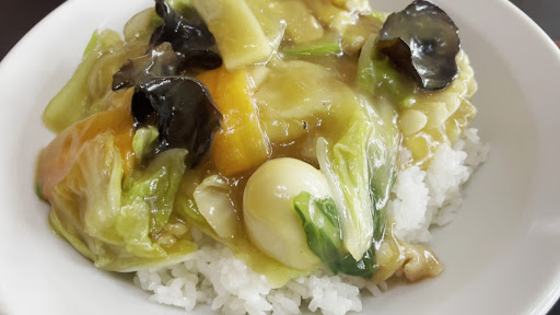 具材は、白菜、人参、木耳、豚肉、エビ、うずらの卵、ハムなどオーソドックスなもので、味は普通の町中華そのものです。私はここのお店では大量のお酢を掛けて食べるのが好きです。