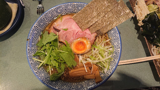 存在感抜群の海苔と、スープに浸るアオサが、海苔好きには嬉しい。程よい歯ごたえの麺にシャキシャキの水菜、ローストビーフのように柔らかいチャーシューと煮玉子...